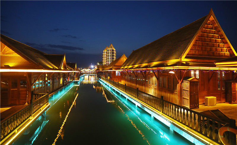 2019年5月26日,云南省西双版纳州,璀璨迷人的告庄西双景点亮景洪夏日夜幕。景洪市告庄西双景灯光灿烂的湄公河水乡夜景。