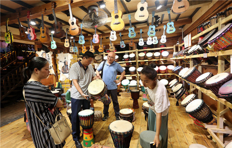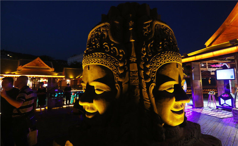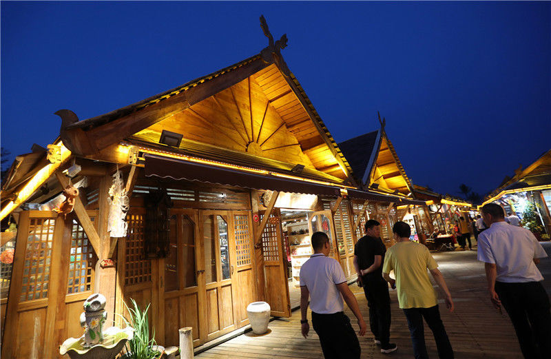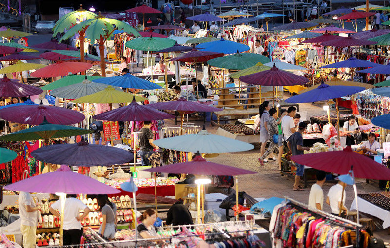 2019年5月26日,云南省西双版纳州,璀璨迷人的告庄西双景点亮景洪夏日夜幕。在景洪市告庄西双景,销售特色旅游工艺品的商店吸引游人。