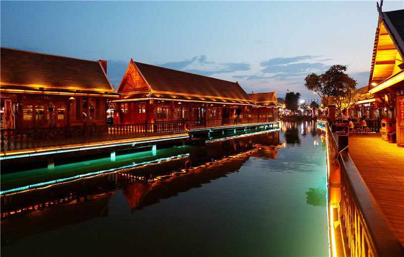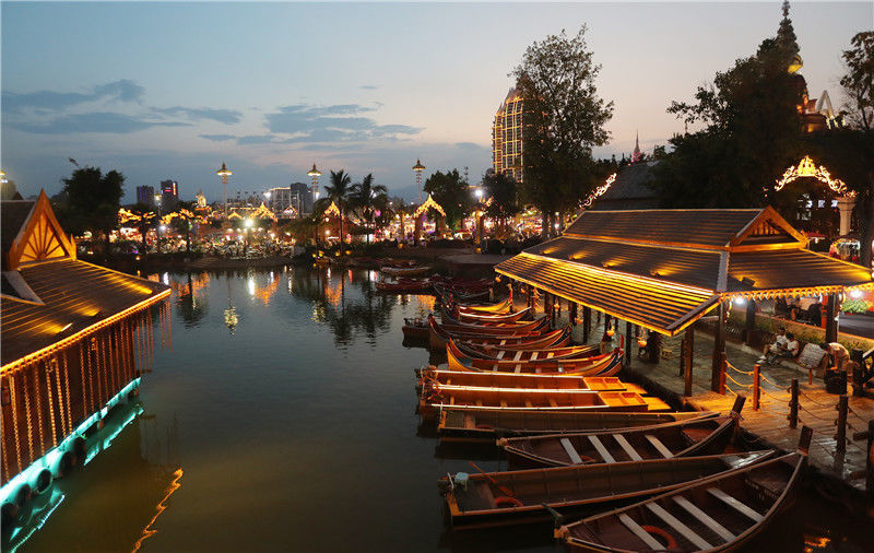 2019年5月26日,云南省西双版纳州,璀璨迷人的告庄西双景点亮景洪夏日夜幕。景洪市告庄西双景灯火辉煌、热闹异常的星光夜市。