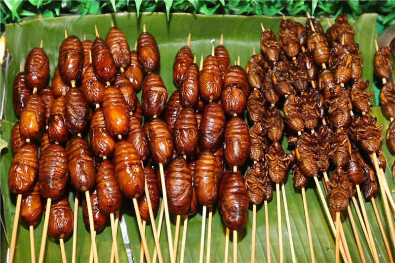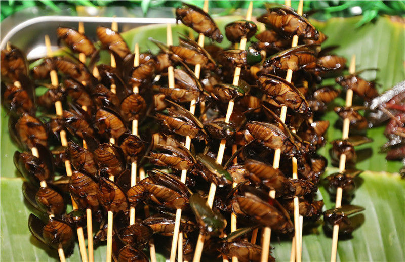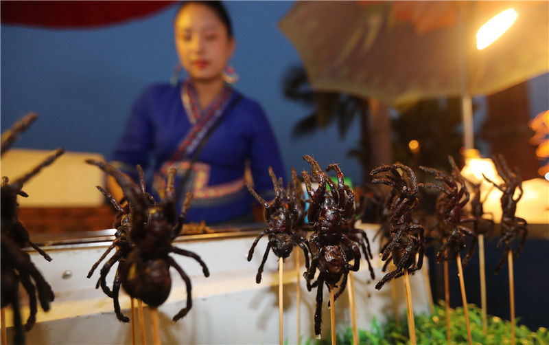 2019年5月26日,云南省西双版纳州,璀璨迷人的告庄西双景点亮景洪夏日夜幕。景洪市告庄西双景星光夜市上的傣味特色昆虫烧烤。