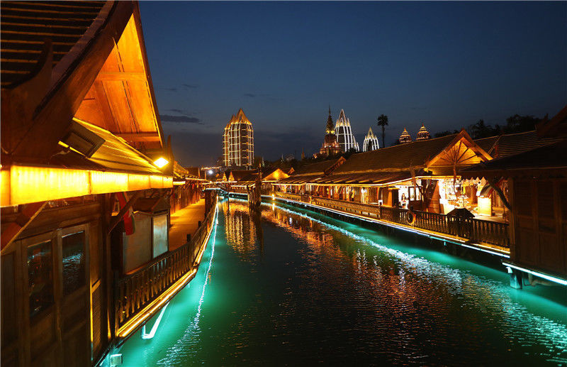2019年5月26日,云南省西双版纳州,璀璨迷人的告庄西双景点亮景洪夏日夜幕。景洪市告庄西双景特色商贸区充满东南亚文化特色和氛围。