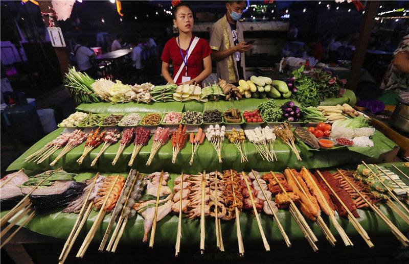 2019年5月26日,云南省西双版纳州,璀璨迷人的告庄西双景点亮景洪夏日夜幕。景洪市告庄西双景星光夜市上的傣味特色烧烤。