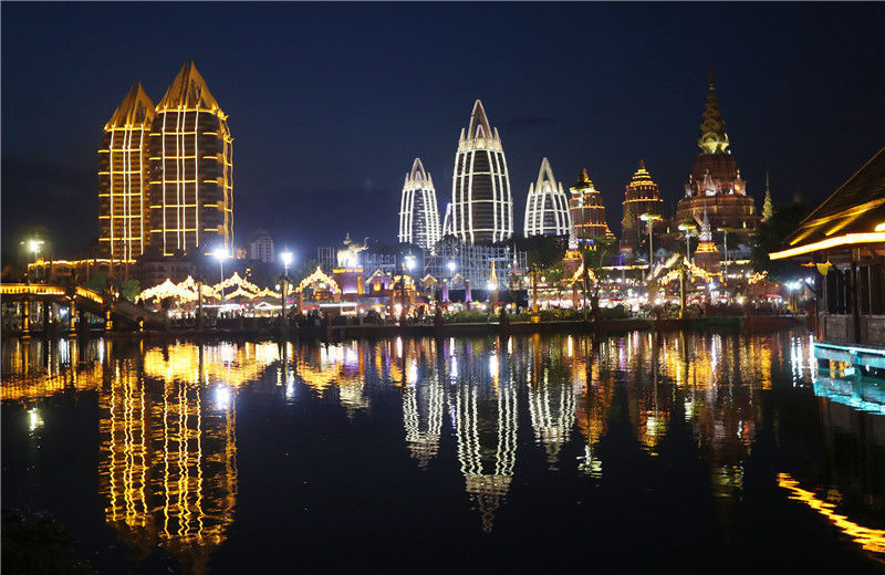 2019年5月26日,云南省西双版纳州,璀璨迷人的告庄西双景点亮景洪夏日夜幕。景洪市告庄西双景灯光灿烂的湄公河水乡夜景。