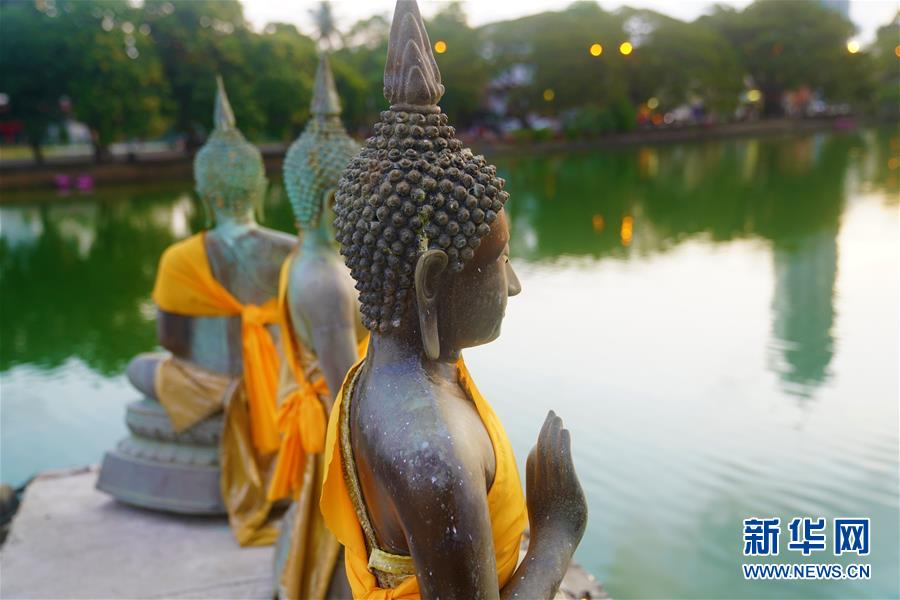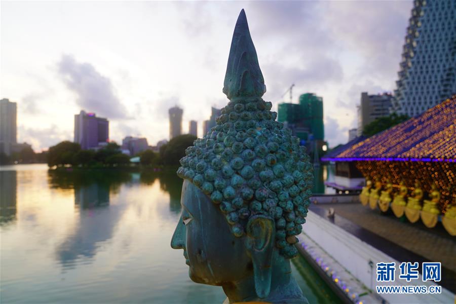 这是夕阳下的斯里兰卡科伦坡水中庙佛像(5月27日摄)。 在科伦坡贝拉湖上有一座木造楼阁——水中庙。木造建筑上面覆盖着蓝瓦,外围环绕着线条优美的佛像。楼阁外高台上供奉的佛像,与不远处的高层建筑相互映照。祥和宁静的水中庙已成为人们修心、祈福的重要场所。 新华社记者唐璐摄