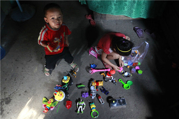 2013年5月24日,广西柳州,7岁女孩小英和5岁的弟弟小林把玩具摊在地上玩,这些玩具都是做环卫工的父亲捡来的。来源:视觉中国