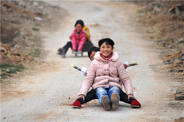 2013年2月21日,山西芮城,利用村里的斜坡路玩滑滑车的女孩。