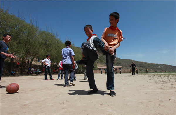 2012年05月30日,甘肃省兰州市,榆中县苏堡小学孩子们在玩斗鸡游戏。