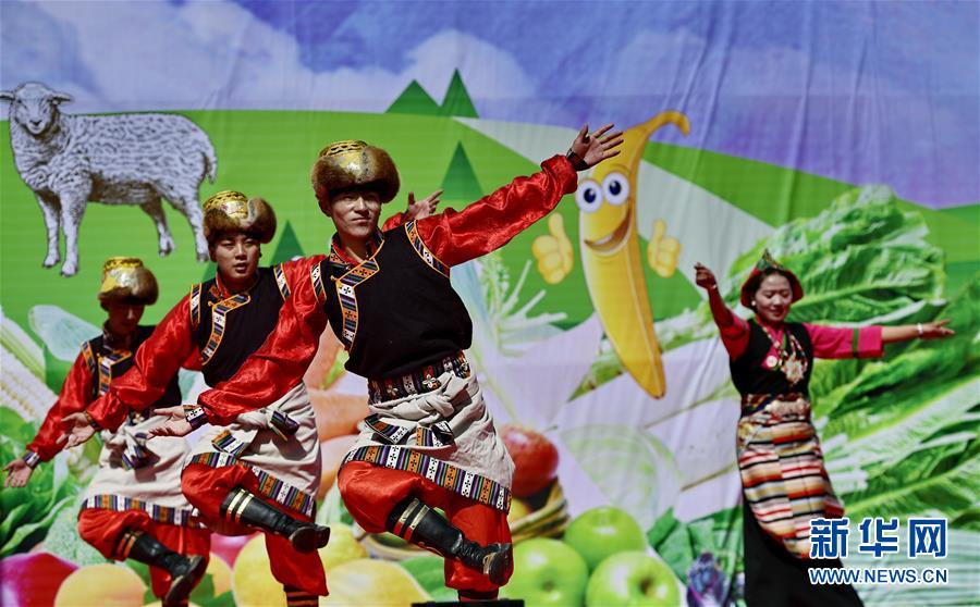 5月28日,演员在白朗县第九届果蔬采摘节上表演。 近日,西藏日喀则市白朗县1.46万亩瓜果蔬菜喜获丰收。百姓们在县里的丰登广场载歌载舞,庆祝白朗县第九届果蔬采摘节。 新华社记者 张汝锋 摄