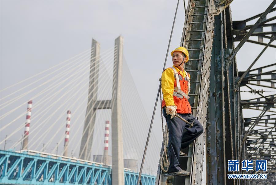 中国铁路成都局有限公司重庆工务段53岁的桥隧工唐金华在白沙沱长江大桥的作业点上望着新白沙沱长江特大桥(4月23日摄)。 4月23日下午5点40分,随着重庆白沙沱长江大桥通行的最后一列客运列车顺利通过,这座“服役”了59年的重庆首座长江大桥进入“退役”倒计时。4月24日后,所有列车将改线经距白沙沱长江大桥约100米的新白沙沱长江特大桥通行,新桥“接力”老桥,运输能力将得到大幅提升。 白沙沱长江大桥于1958年开工,1960年通过首趟列车,是继武汉长江大桥之后的第二座长江大桥。 新华社记者 刘潺 摄