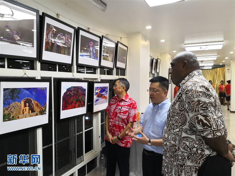 5月29日,在斐济苏瓦,中国驻斐济大使钱波(中)与斐济中国文化中心主任邓先富(左)陪同嘉宾观看展出的精美图片。 为期5天的中国旅游文化周及美食节活动29日晚在斐济首都苏瓦拉开帷幕,来自中斐两国的约200名嘉宾出席了开幕式。开幕式上,嘉宾们观看了反映中国宁夏自然风光和人文风貌的精美图片以及中国非物质文化遗产展,来自宁夏的艺术家表演了精彩文艺节目,来自江苏的大厨为嘉宾带来了淮扬菜。 新华社记者 张永兴 摄