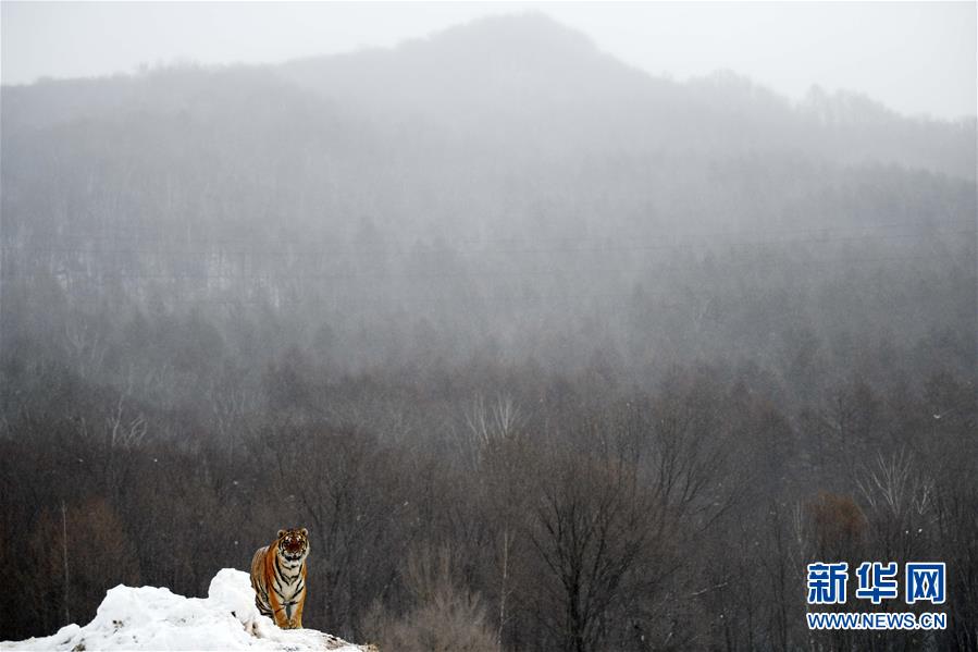 在位于黑龙江省海林市的横道河子东北虎林园散放区,一只东北虎站在雪中(2018年11月22日摄)。新华社记者王建威摄