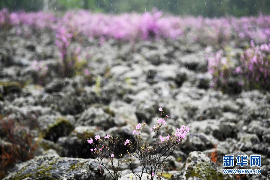 这是位于小兴安岭北麓的黑龙江省伊春红星火山地质公园内雨中盛开的兴安杜鹃(5月13日摄)。新华社记者王建威摄