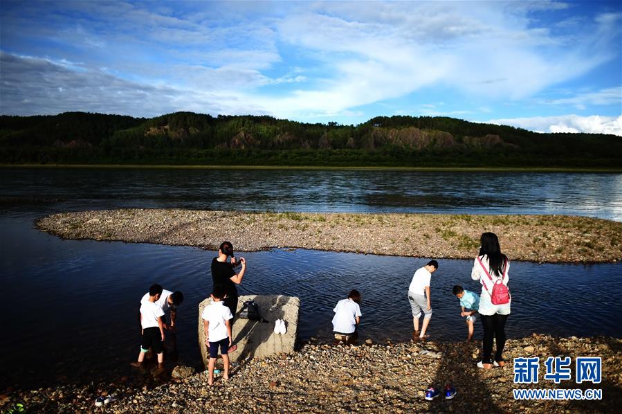 在黑龙江省漠河市北极村附近的黑龙江畔,游客在水边游玩(2017年7月31日摄)。新华社记者王建威摄