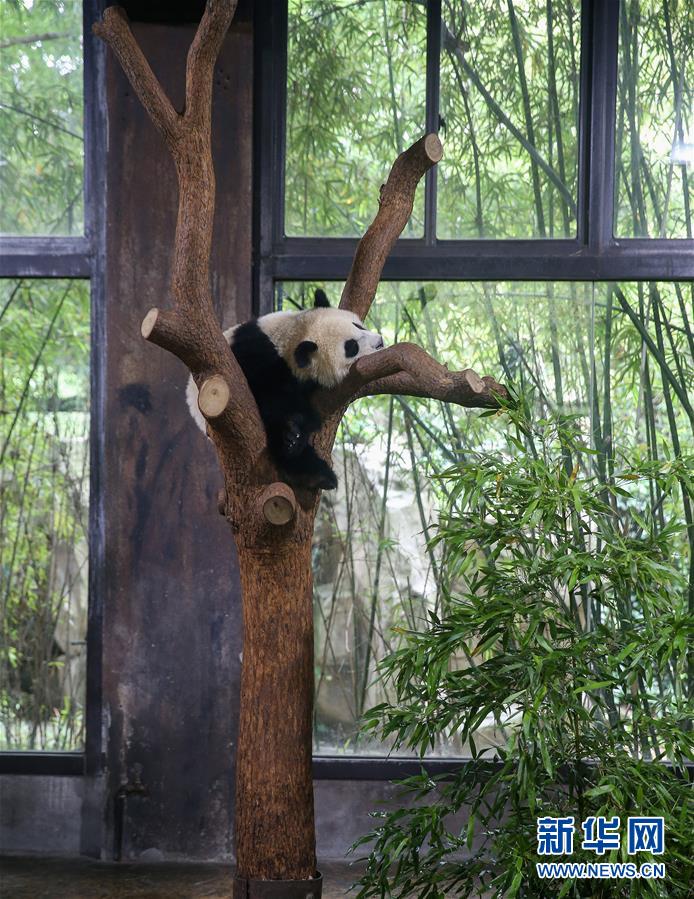6月1日,在上海野生动物园,大熊猫宝宝“七七”在树上休息。当日,上海野生动物园举行命名仪式,宣布一只10个月大的大熊猫宝宝被正式命名为“七七”。新华社记者丁汀摄