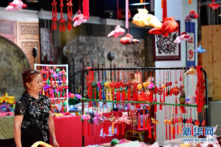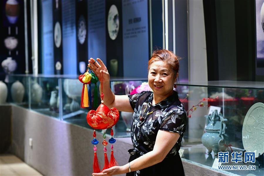 在郑州市非物质文化遗产展示馆,芦爱玲在展示自己制作的“时时事事如意”香包(6月2日摄)。 新华社记者 冯大鹏 摄