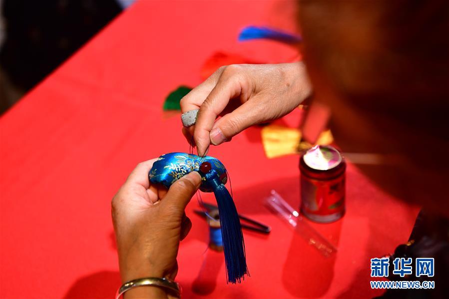 在郑州市非物质文化遗产展示馆,芦爱玲正在制作香包(6月2日摄)。 新华社记者 冯大鹏 摄