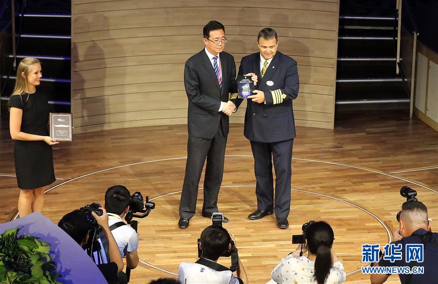 “海洋光谱号”邮轮与上海吴淞口国际邮轮港相互交换铭牌仪式(6月3日摄)。 6月3日,经过为期47天的环球之旅,皇家加勒比邮轮“海洋光谱号”搭载近5000名国际游客靠泊上海吴淞口国际邮轮港,这也是自2011年上海吴淞口国际邮轮港开港以来迎来的第2000艘次母港邮轮。 新华社记者 陈飞 摄