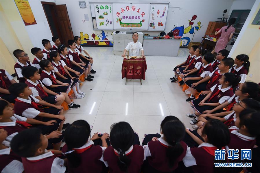 6月4日,洲泉镇洲泉实验小学的学生们在端午民俗课上听桐乡传统民间曲艺“三跳书”。新华社记者 徐昱 摄