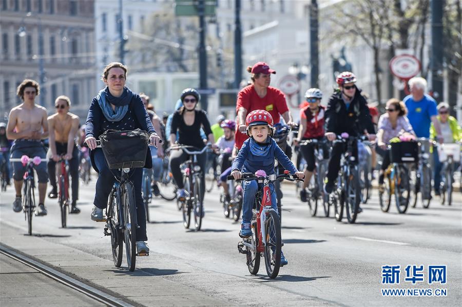 这是2019年3月31日,在奥地利维也纳,自行车爱好者参加2019自行车骑行嘉年华活动。新华社记者郭晨摄