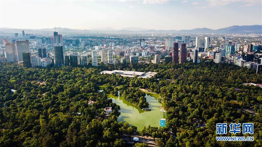 这是2019年4月18日在墨西哥首都墨西哥城用无人机拍摄的查普特佩克森林公园内的湖泊。该公园是墨西哥城重要的城市绿肺和著名的文化中心。新华社记者辛悦卫摄