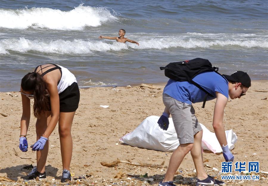 这是2018年8月25日,在黎巴嫩首都贝鲁特以南一处海滩,环保志愿者清理垃圾。新华社发(比拉尔·贾维希摄)