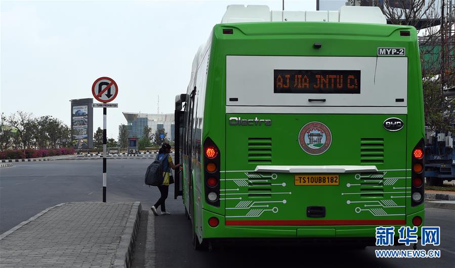 这是2019年3月26日,在印度海德拉巴市,乘客乘坐电动大巴出行。新华社记者张迺杰摄