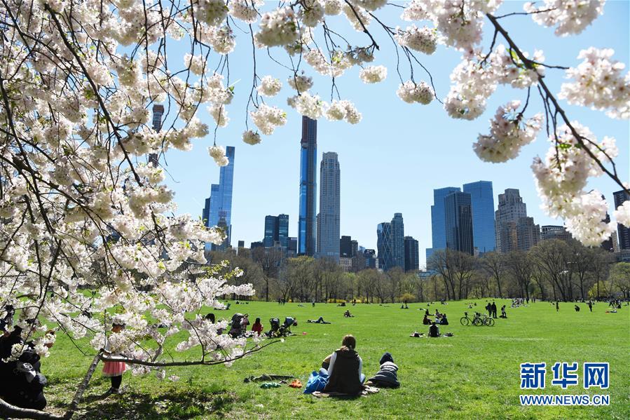 这是2019年4月16日,人们在美国纽约中央公园的草坪上休憩。新华社记者韩芳摄