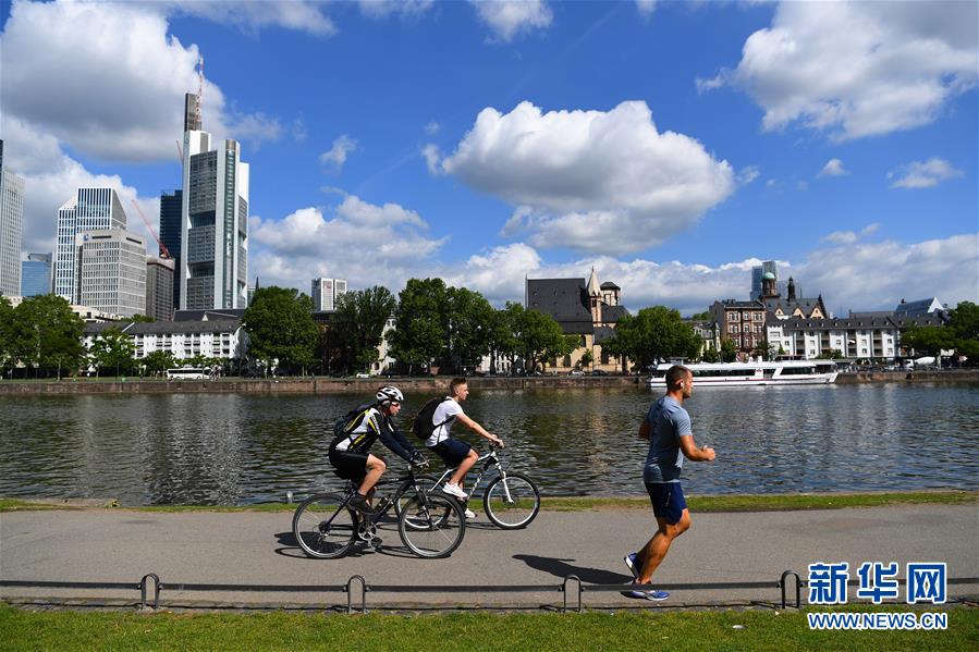 这是2019年5月31日,在德国法兰克福,人们在美因河畔休闲健身。新华社记者逯阳摄