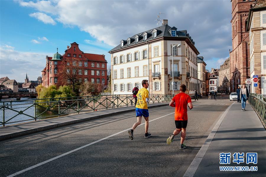 这是2019年3月26日,在法国斯特拉斯堡,两名男子在街头跑步锻炼。新华社记者张铖摄