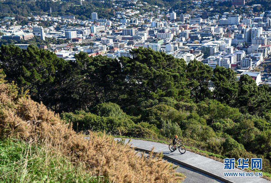 这是2019年6月3日,在新西兰首都惠灵顿,一名男孩在维多利亚山上骑行。新华社记者郭磊摄