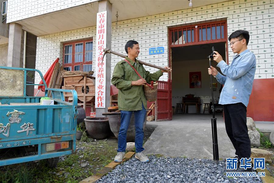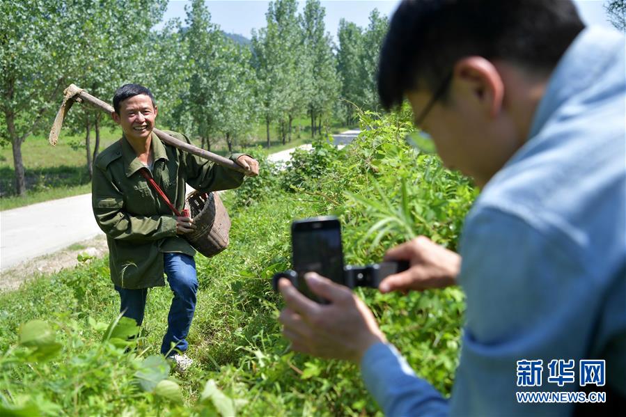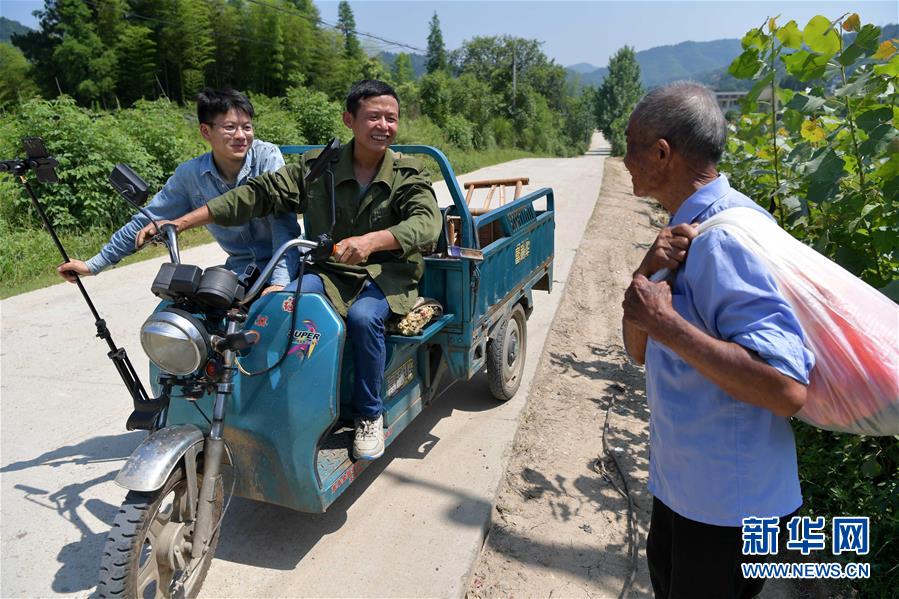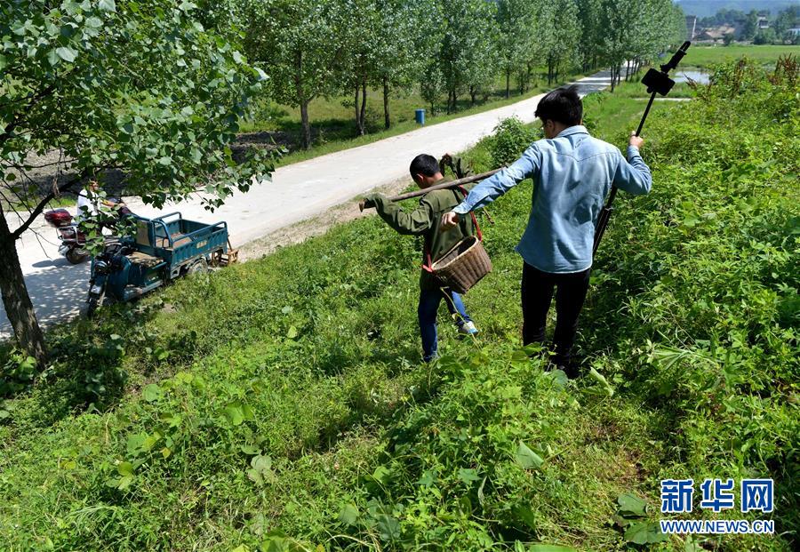 在温汤镇下巩村,彭杰(右)给准备进山挖葛根的乐文秋录制视频(6月4日摄)。新华社记者 彭昭之 摄
