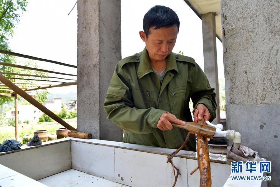 在温汤镇下巩村,乐文秋将挖到的新鲜葛根洗净(6月4日摄)。新华社记者 彭昭之 摄