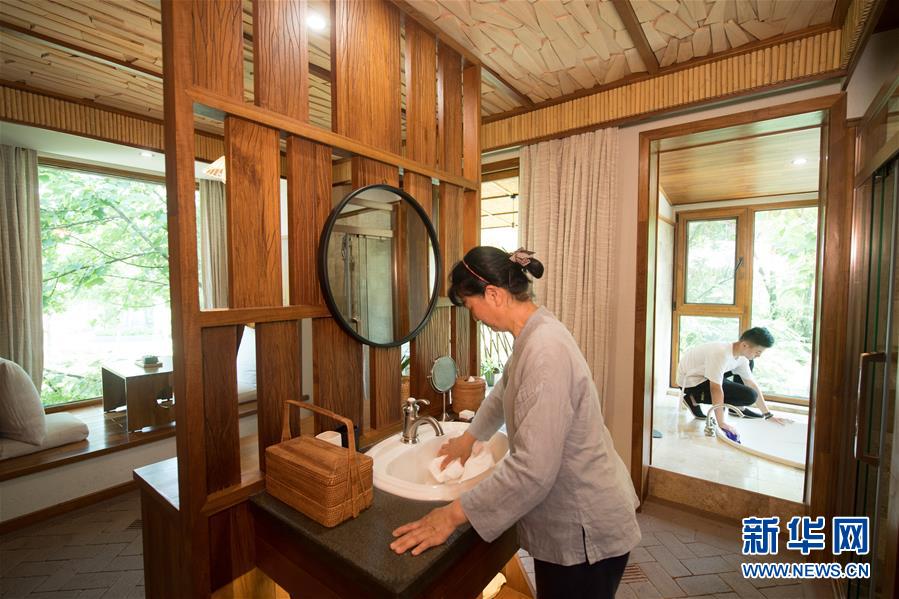 6月4日,工作人员在“小瘾·半日村”一家民宿内清扫房间。新华社记者翁忻旸摄