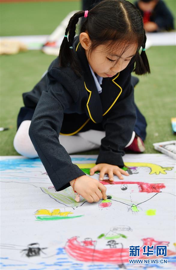 6月5日,陕西师范大学附属小学的学生在长卷上画龙舟。