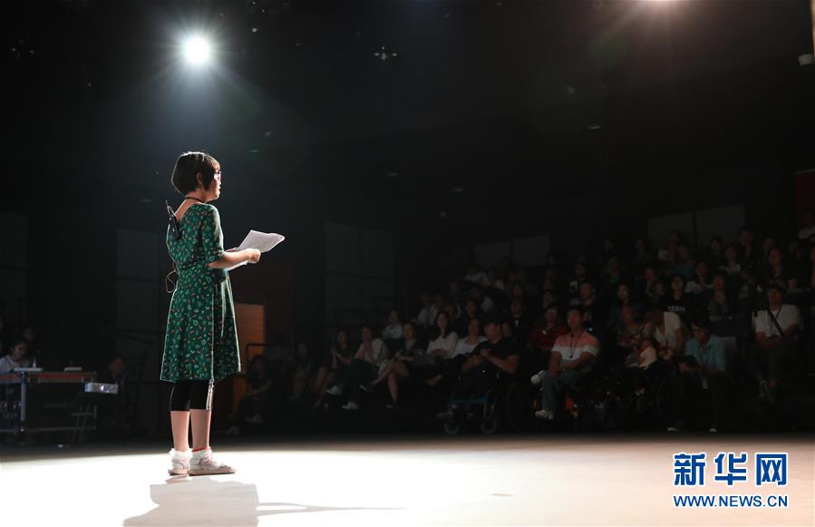 6月5日,孙靖茹在台上讲述她与自闭症哥哥的故事。 新华社记者 方喆 摄