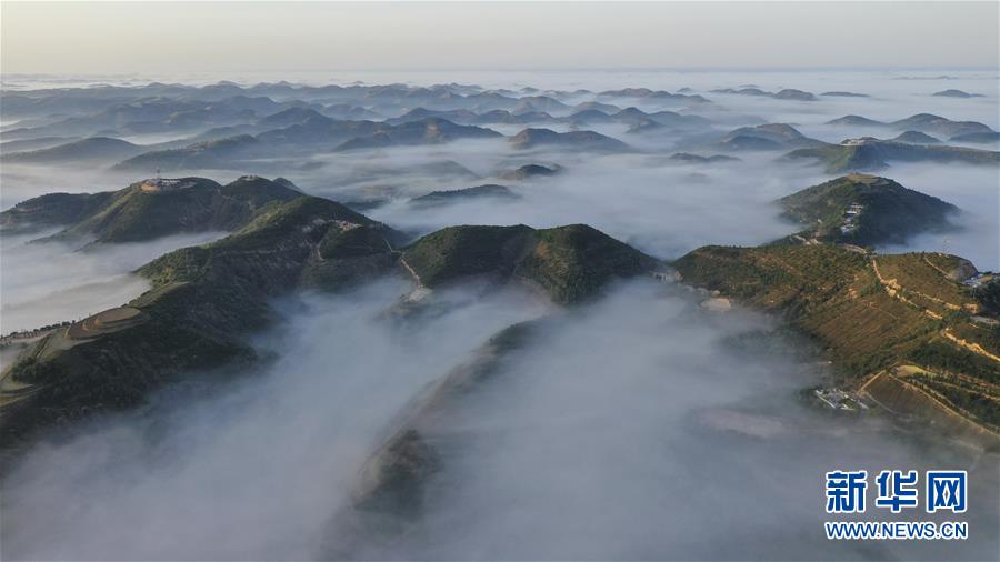 6月6日无人机拍摄的吴起县吴起街道走马台村杨青流域流动的云海。 新华社记者 陶明 摄