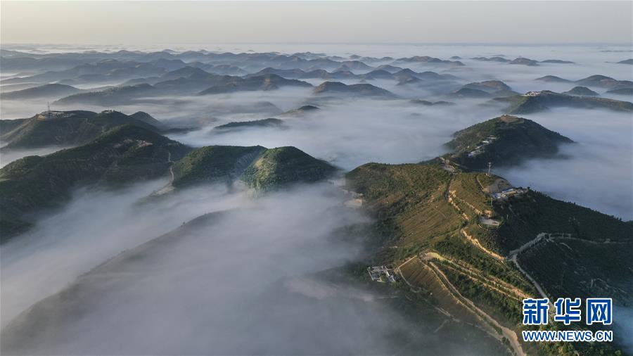 6月6日,吴起县吴起街道走马台村杨青流域的山峁,云海翻腾,美若图画(无人机拍摄)。 新华社记者 陶明 摄