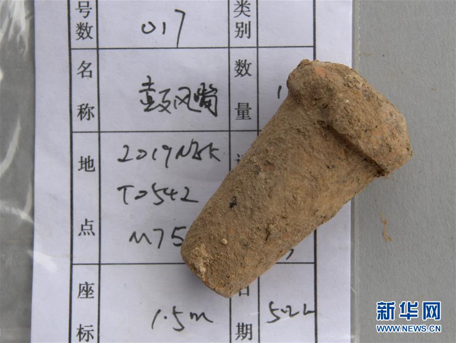 这是在河南省安阳市洹北商城商代铸铜工匠家族墓地内清理发掘出的鼓风嘴(6月5日摄)。 新华社记者 李安 摄