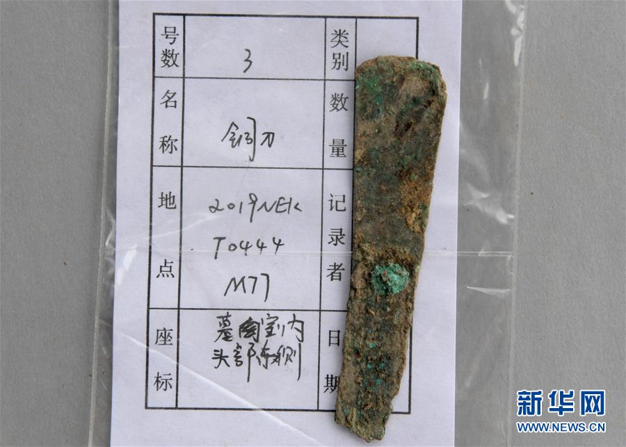 这是在河南省安阳市洹北商城商代铸铜工匠家族墓地内清理发掘出的铜刀(6月5日摄)。 新华社记者 李安 摄