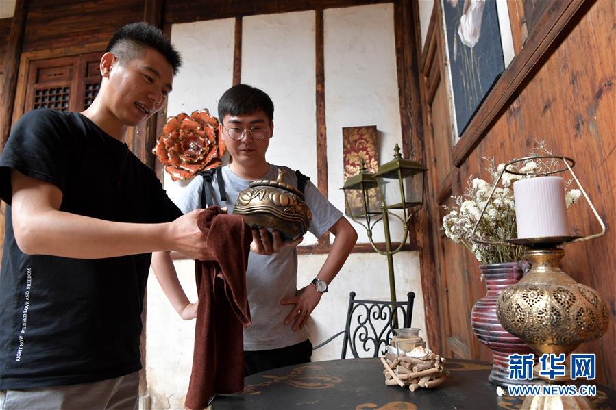 万载古城一家以手工艺品为主题的民宿老板(左)在向住客介绍工艺品(6月6日摄)。新华社记者 彭昭之 摄