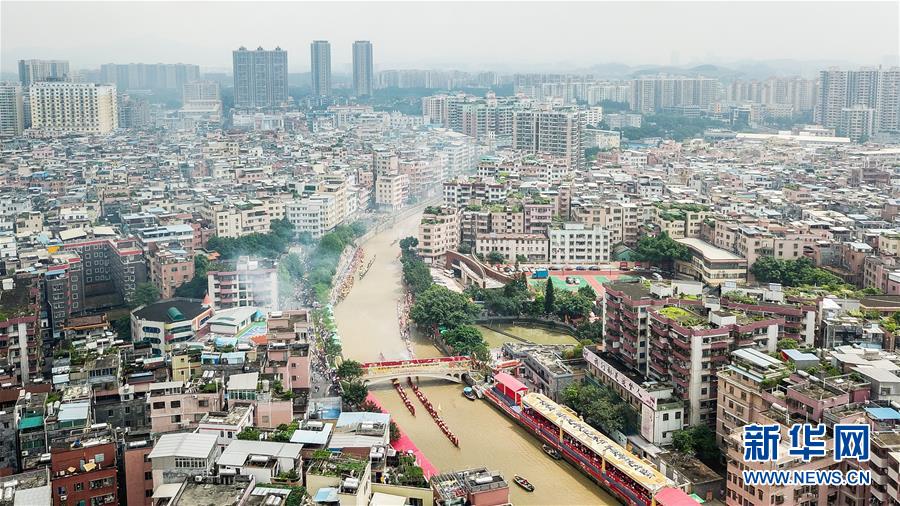 6月4日,人们在福州市仓山区林浦河上划龙舟(无人机拍摄)。新华社记者 姜克红 摄
