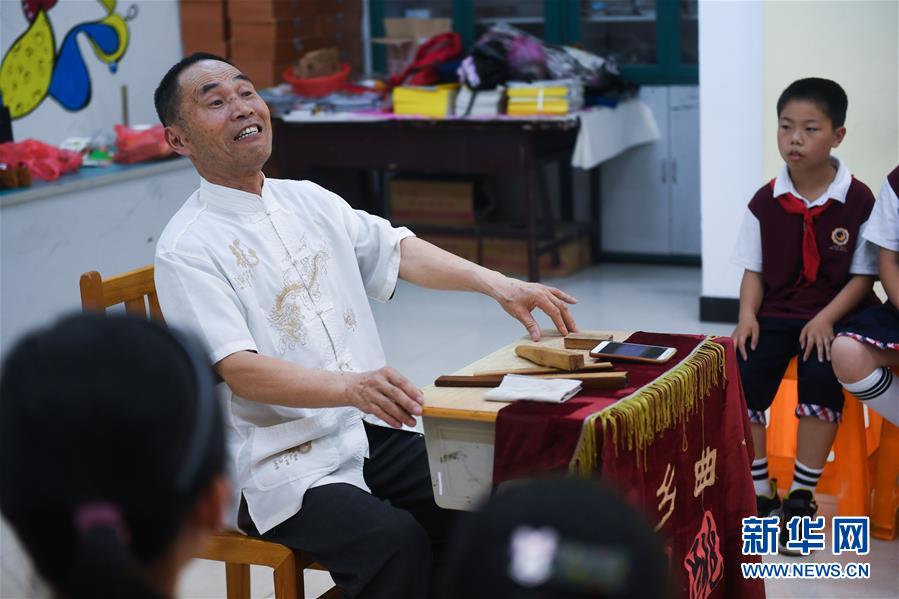 6月4日,表演者在洲泉镇洲泉实验小学的端午民俗课上为学生表演桐乡传统民间曲艺“三跳书”。新华社记者 徐昱 摄