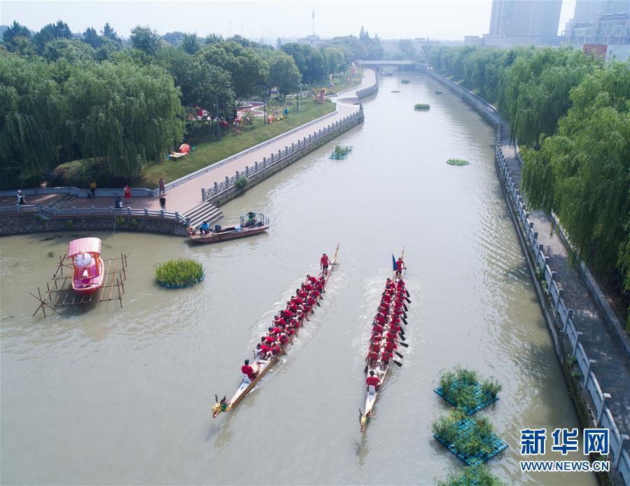 6月4日,桐乡市洲泉镇的龙舟队在湘溪公园旁的河道中开展训练,他们将代表桐乡参加2019嘉兴端午民俗文化节的龙舟竞渡(无人机拍摄)。新华社记者 徐昱 摄