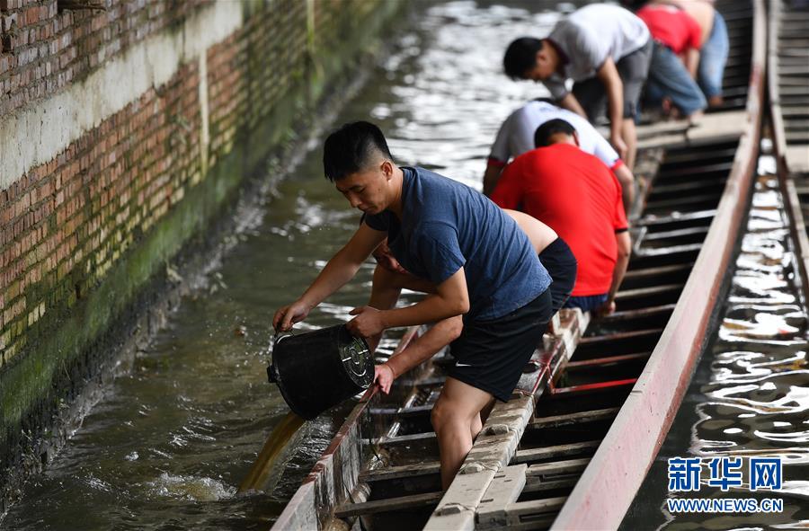 车陂梁氏族人在车陂涌的龙船坞里进行龙舟起龙仪式(5月25日摄)。新华社记者刘大伟摄