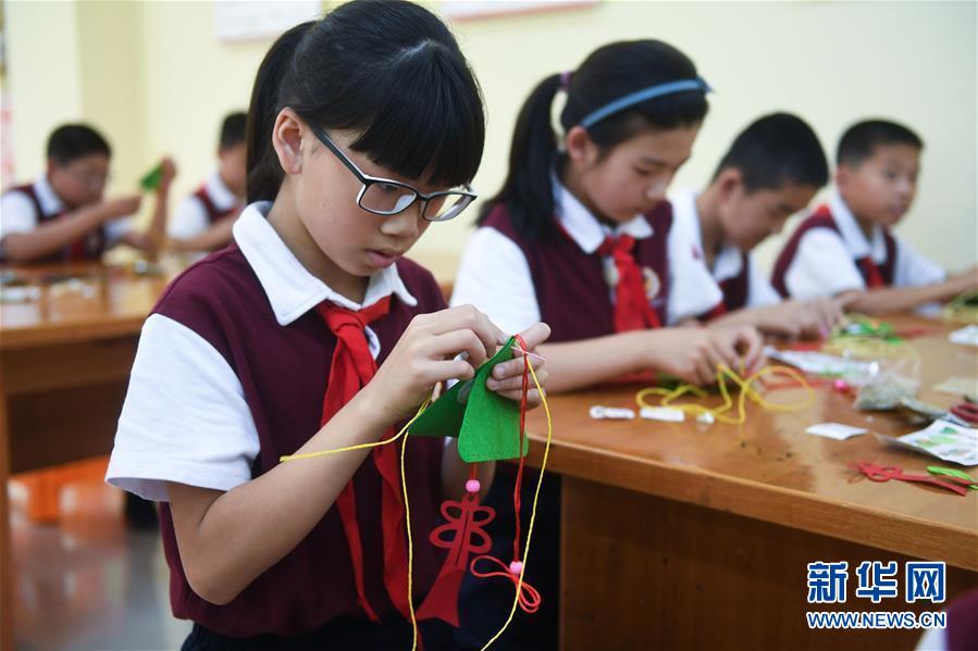 6月4日,洲泉镇洲泉实验小学的学生们在端午民俗课上学习香袋的制作。
