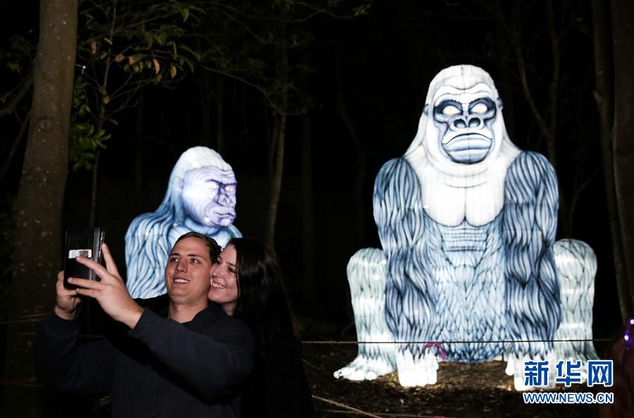6月8日,在澳大利亚悉尼塔朗加动物园,游客在大猩猩造型花灯前合影。新华社记者 白雪飞 摄