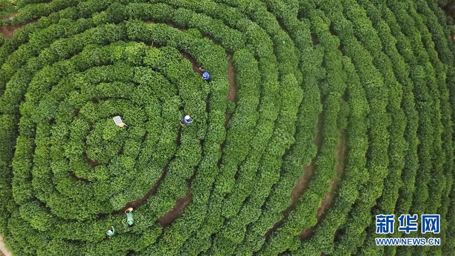 4月16日,茶农在安徽黄山市黄山区猴坑村一处茶园内采茶(无人机拍摄)。新华社记者 张端 摄