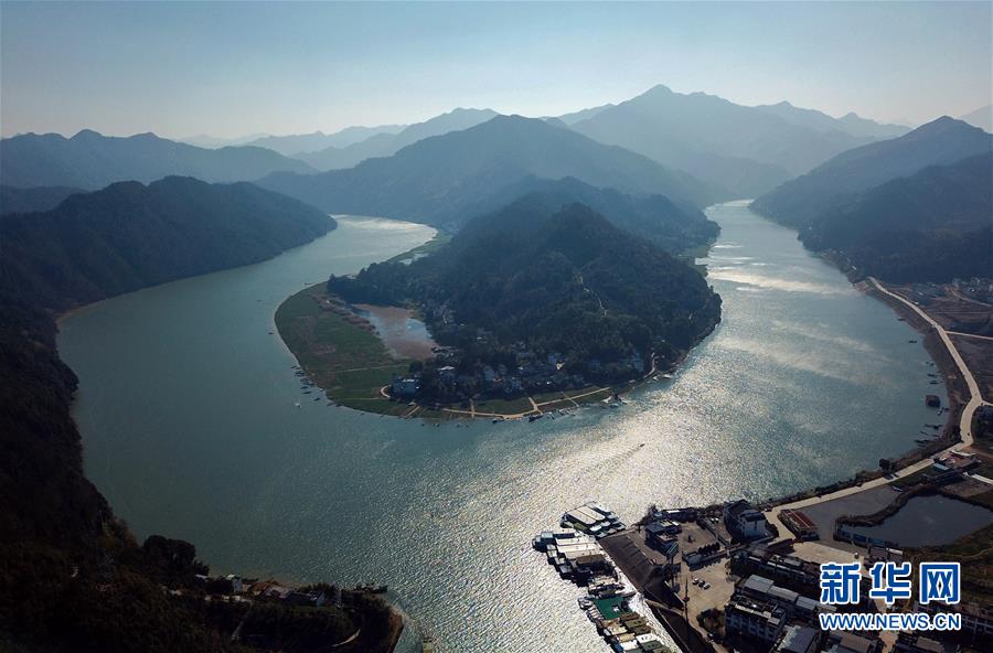 1月18日在安徽省黄山市歙县拍摄的新安江山水画廊美景(无人机拍摄)。新华社发(施亚磊 摄)