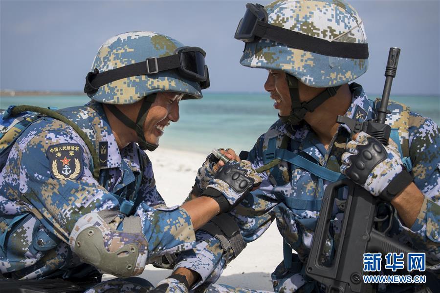 中建岛守备营官兵在进行沙滩训练(5月19日摄)。 新华社记者 琚振华 摄