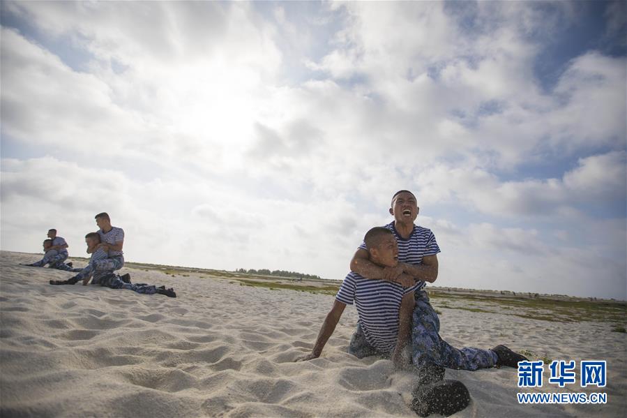 中建岛守备营官兵在进行沙滩训练(5月19日摄)。 新华社记者 琚振华 摄